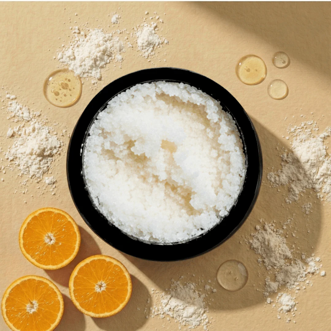 Sweet Orange, Frankincense and Petitgrain: A beautifully bright and uplifting aromatic blend that invigorates your senses while you scrub.